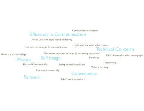 During initial user research, our team chose to focus on college students and young professionals as our primary audience since these groups are most likely to meet the minimal requirements for expertise and technology. After identifying our audience, we surveyed potential users to discover how they currently use technology to communicate. From their responses, we identified recurring concerns that influence interaction with a video comunication system and we identified the contexts in which video communication would be most welcome. At the conclusion of initial user research, we established the mission for this project, to "enable easy creation of video to enhance communication in established personal relationships by emphasizing message quality within specific contexts."